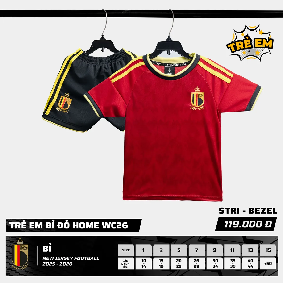 Bộ Quần Áo Bóng Đá Trẻ Em Strivend Bỉ Đỏ Đô WC2026 là mẫu áo bóng đá WC mới đến từ Strivend để cùng Bé chuẩn bị cho một mùa WC 2026 cuồng nhiệt sắp tới.