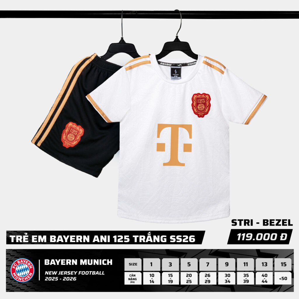 Bộ quần áo bóng đá Trẻ Em Strivend Bayern Ani Trắng 125 SS26, được thiết kế đẹp mắt và đầy ấn tượng dành riêng cho những tín đồ của Hùng Xám nước Đức