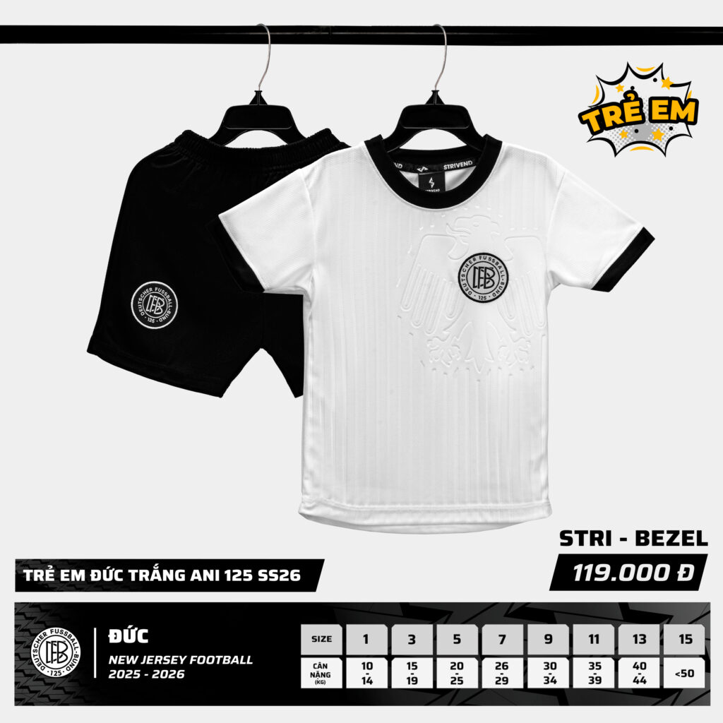 Bộ quần áo bóng đá Trẻ Em Strivend Đức Trắng Ani 125 SS26, được thiết kế đẹp mắt và đầy ấn tượng dành riêng cho những tín đồ của Hùng Xám nước Đức