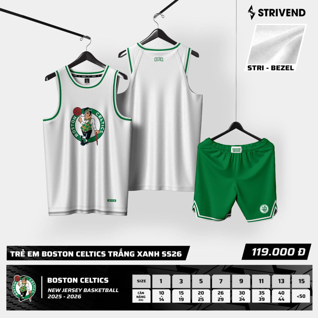 Chất Liệu Cao Cấp vải thun co giãn, thấm hút mồ hôi tốt, đảm bảo sự thoải mái cho bé trong suốt quá trình tập luyện và thi đấu.Thiết Kế Hiện Đại phối màu độc đáo, in logo và số áo lấy cảm hứng từ các đội bóng NBA nổi tiếng Celtics. Đường May Tỉ Mỉ Kỹ thuật may chắc chắn, bền bỉ theo thời gian. Kích Cỡ Đa Dạng phù hợp cho các bé từ 6 đến 12 tuổi.