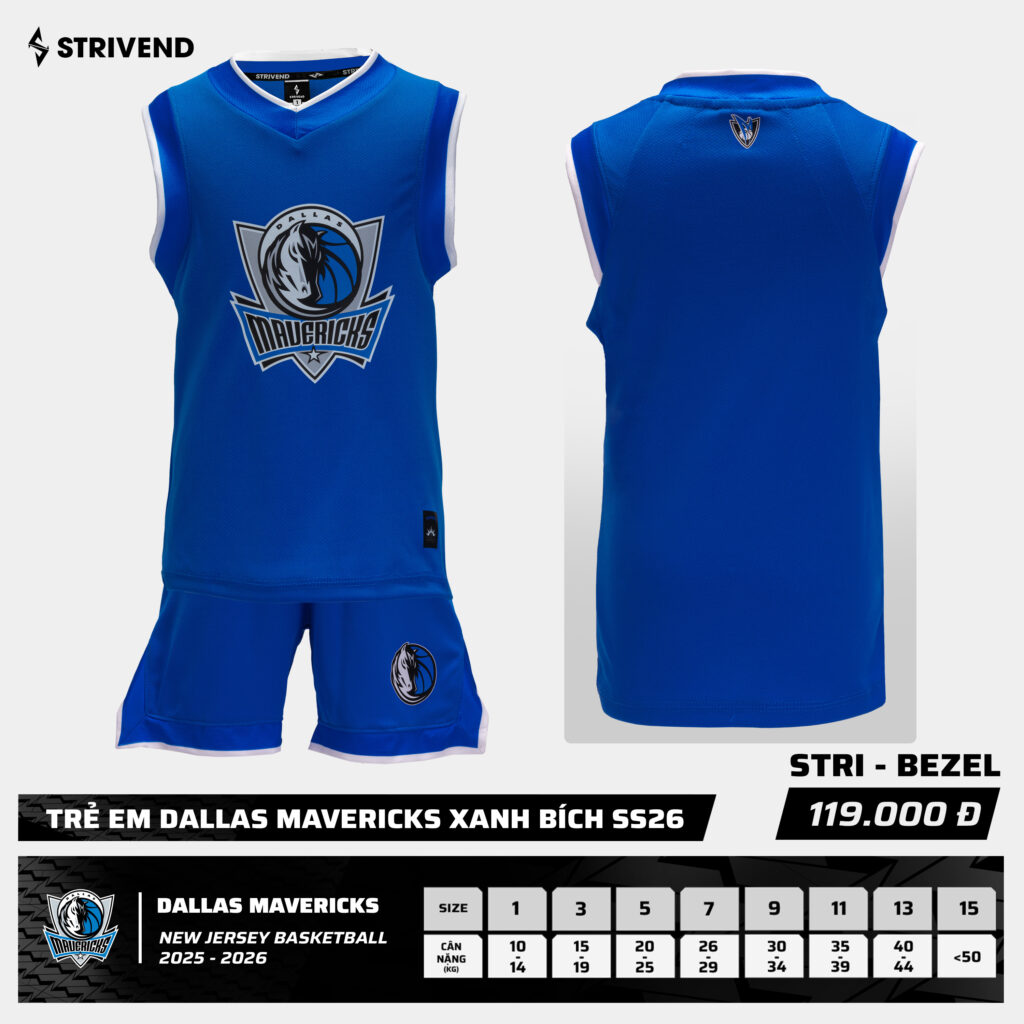 Chất Liệu Cao Cấp vải thun co giãn, thấm hút mồ hôi tốt, đảm bảo sự thoải mái cho bé trong suốt quá trình tập luyện và thi đấu.Thiết Kế Hiện Đại phối màu độc đáo, in logo và số áo lấy cảm hứng từ các đội bóng NBA nổi tiếng Dallas Mavericks. Đường May Tỉ Mỉ Kỹ thuật may chắc chắn, bền bỉ theo thời gian. Kích Cỡ Đa Dạng phù hợp cho các bé từ 6 đến 12 tuổi.