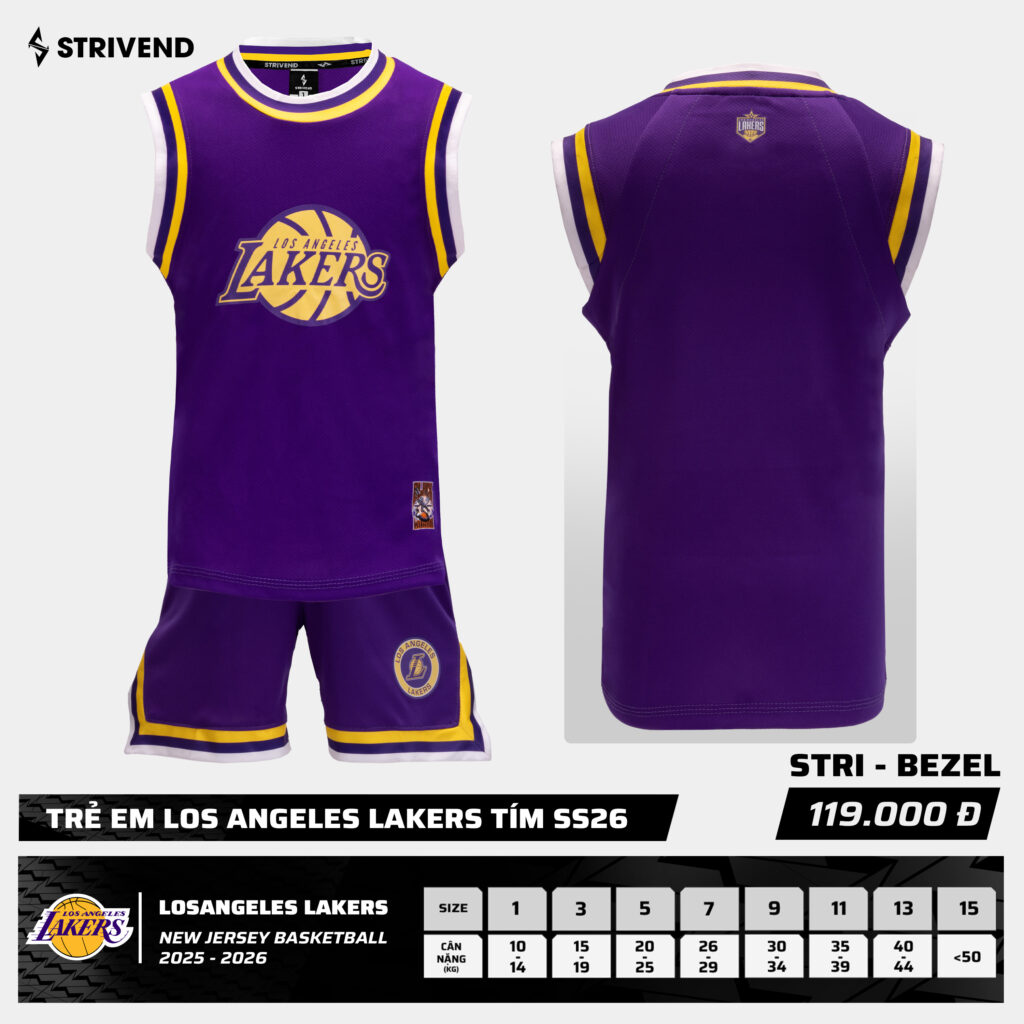 Chất Liệu Cao Cấp vải thun co giãn, thấm hút mồ hôi tốt, đảm bảo sự thoải mái cho bé trong suốt quá trình tập luyện và thi đấu.Thiết Kế Hiện Đại phối màu độc đáo, in logo và số áo lấy cảm hứng từ các đội bóng NBA nổi tiếng Los Angeles Lakers. Đường May Tỉ Mỉ Kỹ thuật may chắc chắn, bền bỉ theo thời gian. Kích Cỡ Đa Dạng phù hợp cho các bé từ 6 đến 12 tuổi.